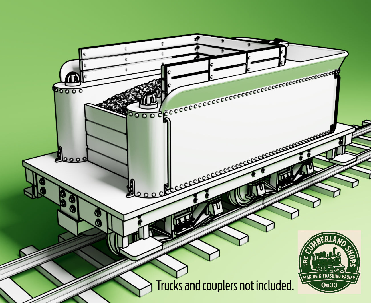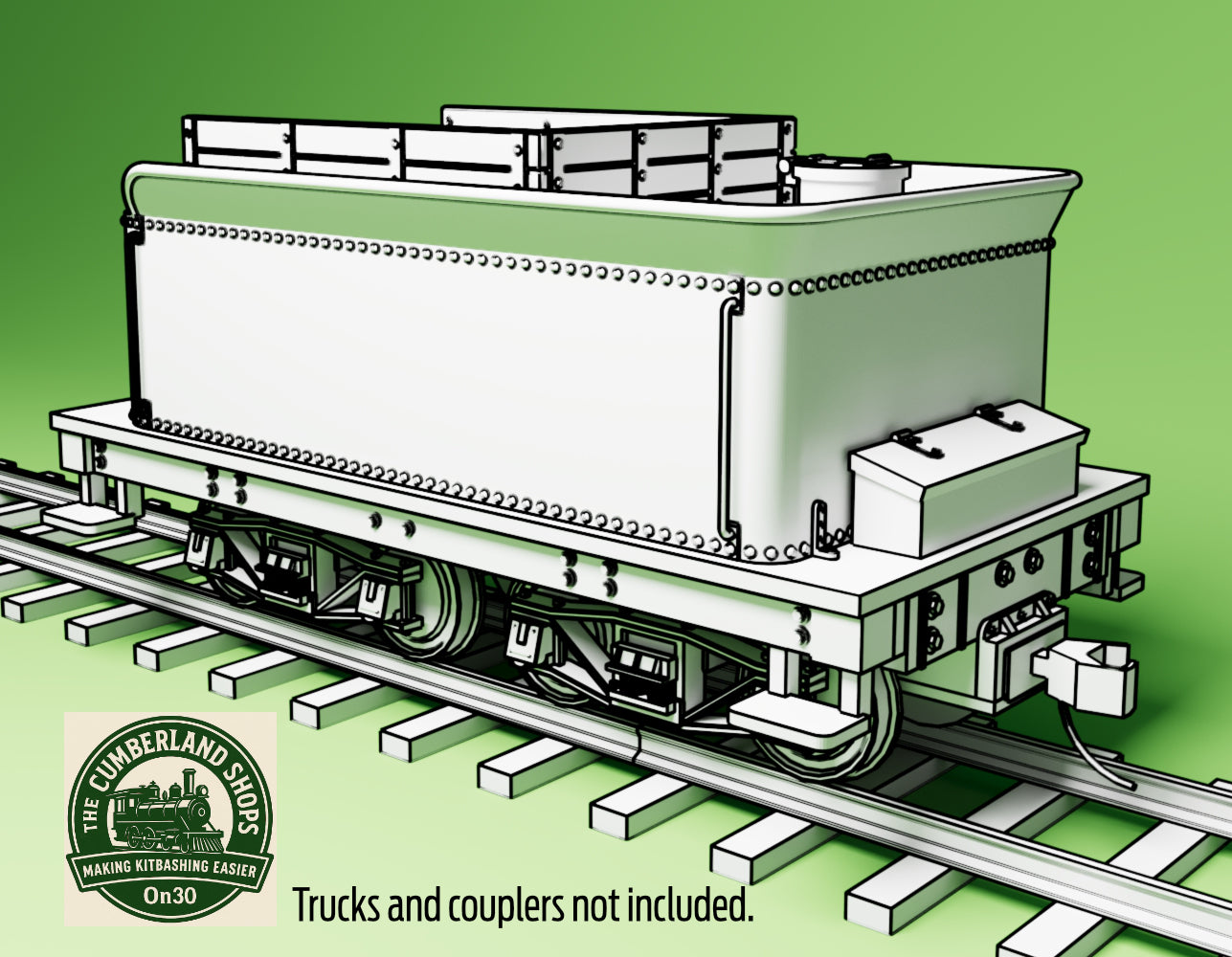 Designed to fit with medium-sized Bachmann On30 locos. It's 3.6” [scale 14’-3”] long and 1.72" [scale 6’-10”] wide. This version is a fuel & water tender, where the front would be filled with wood or coal, and there is a fake coal load in place. Designed to run on standard Bachmann On30 Archbar Trucks [not included], or we have similar arch-bar trucks made to use Kadee wheelsets.