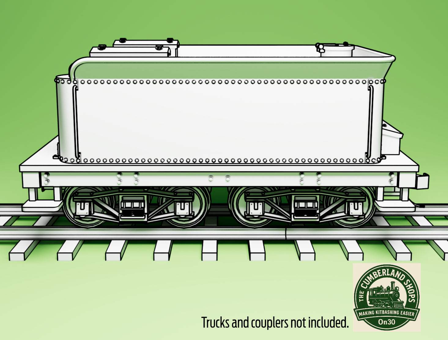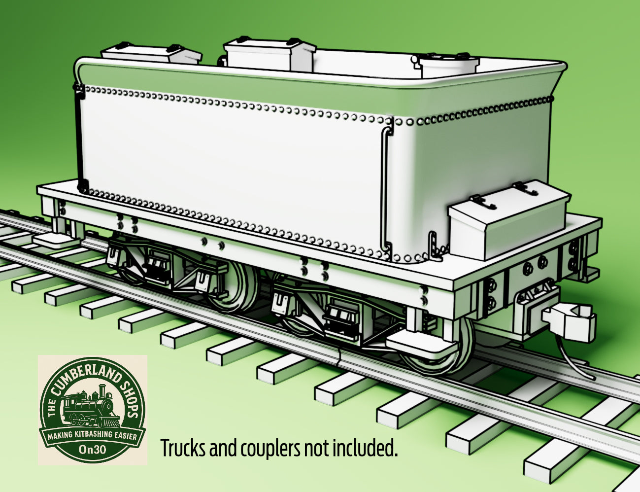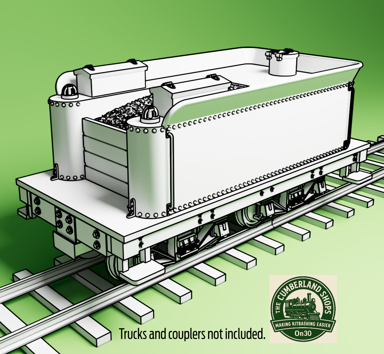 Designed to fit with medium-sized Bachmann On30 locos. It's 3.6” [scale 14’-3”] long and 1.72" [scale 6’-10”] wide. This version is a fuel & water tender, where the front would be filled with wood or coal, and there is a fake coal load in place. Designed to run on standard Bachmann On30 Archbar Trucks [not included], or we have similar arch-bar trucks made to use Kadee wheelsets.