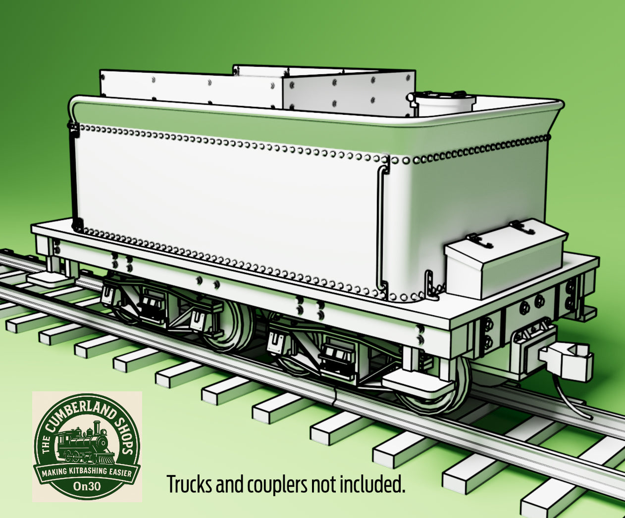 Designed to fit with medium-sized Bachmann On30 locos. It's 3.6” [scale 14’-3”] long and 1.72" [scale 6’-10”] wide. This version is a fuel & water tender, where the front would be filled with wood or coal, and there is a fake coal load in place. Designed to run on standard Bachmann On30 Archbar Trucks [not included], or we have similar arch-bar trucks made to use Kadee wheelsets.