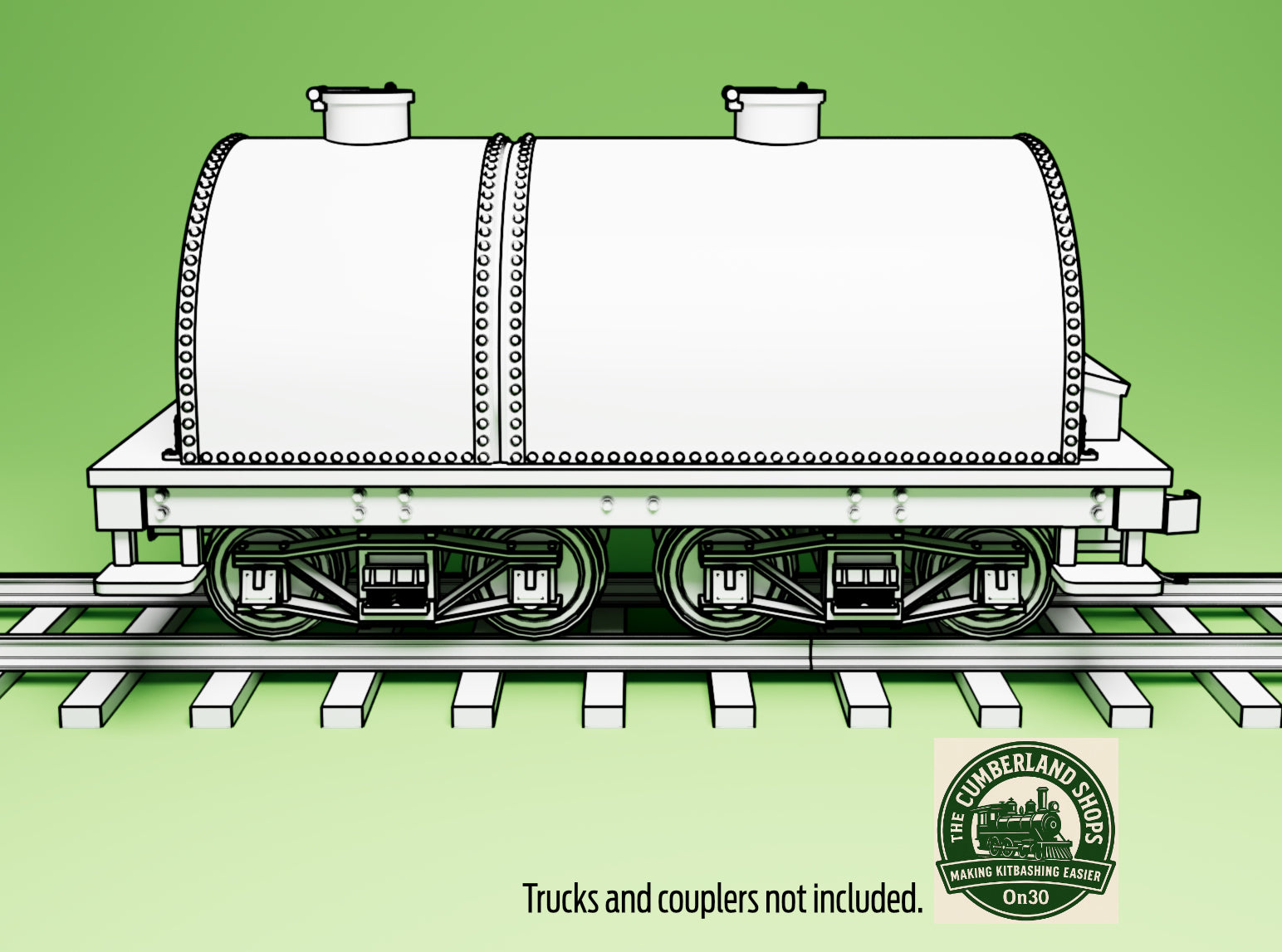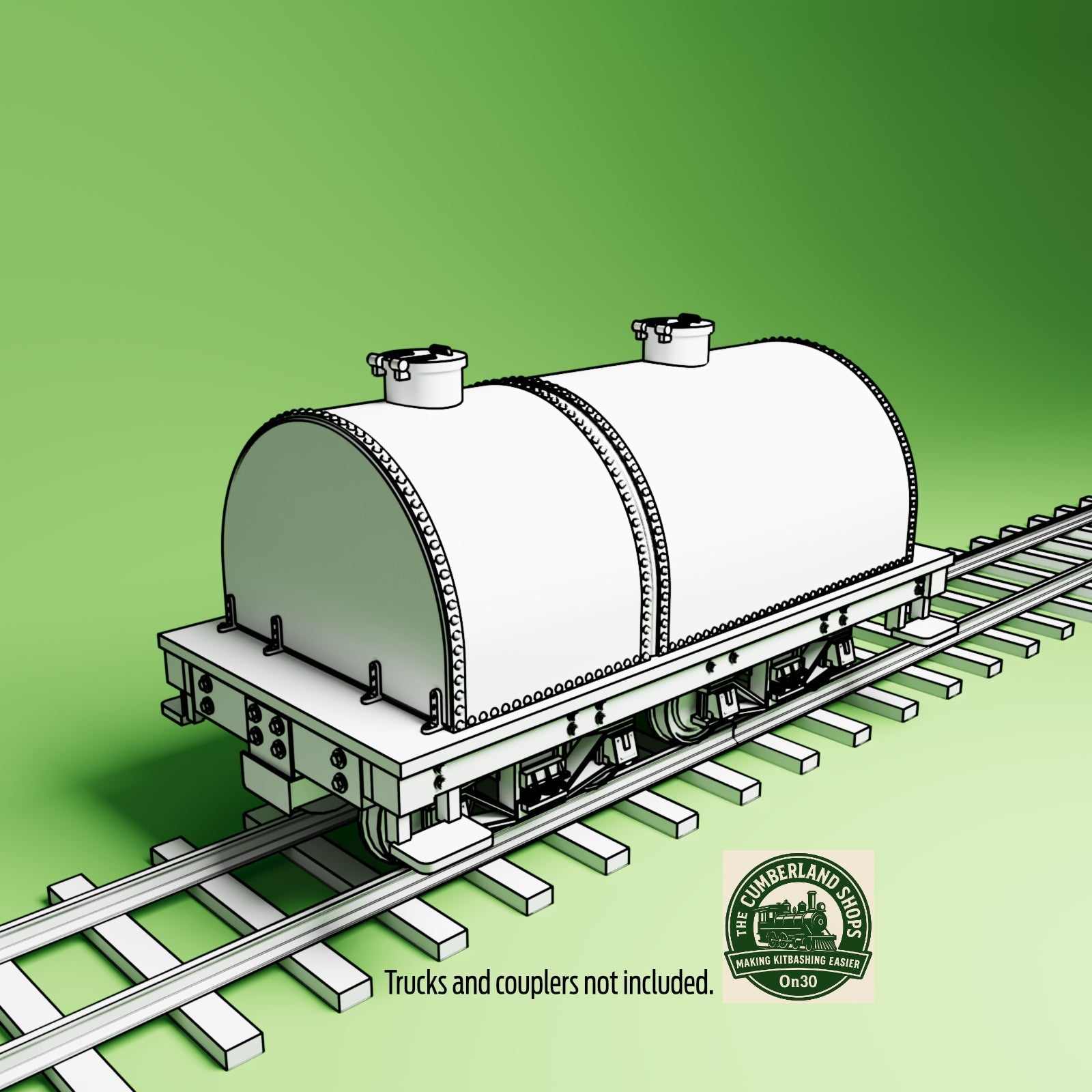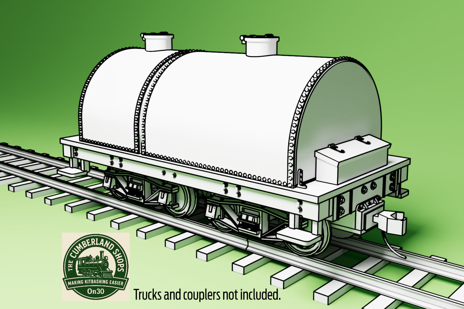 Designed to fit with medium-sized Bachmann On30 locos. It's 3.6” [scale 14’-3”] long and 1.72" [scale 6’-10”] wide. This version is a fuel & water tender, where the front would be filled with oil. Designed to run on standard Bachmann On30 Archbar Trucks [not included], or we have similar arch-bar trucks made to use Kadee wheelsets.