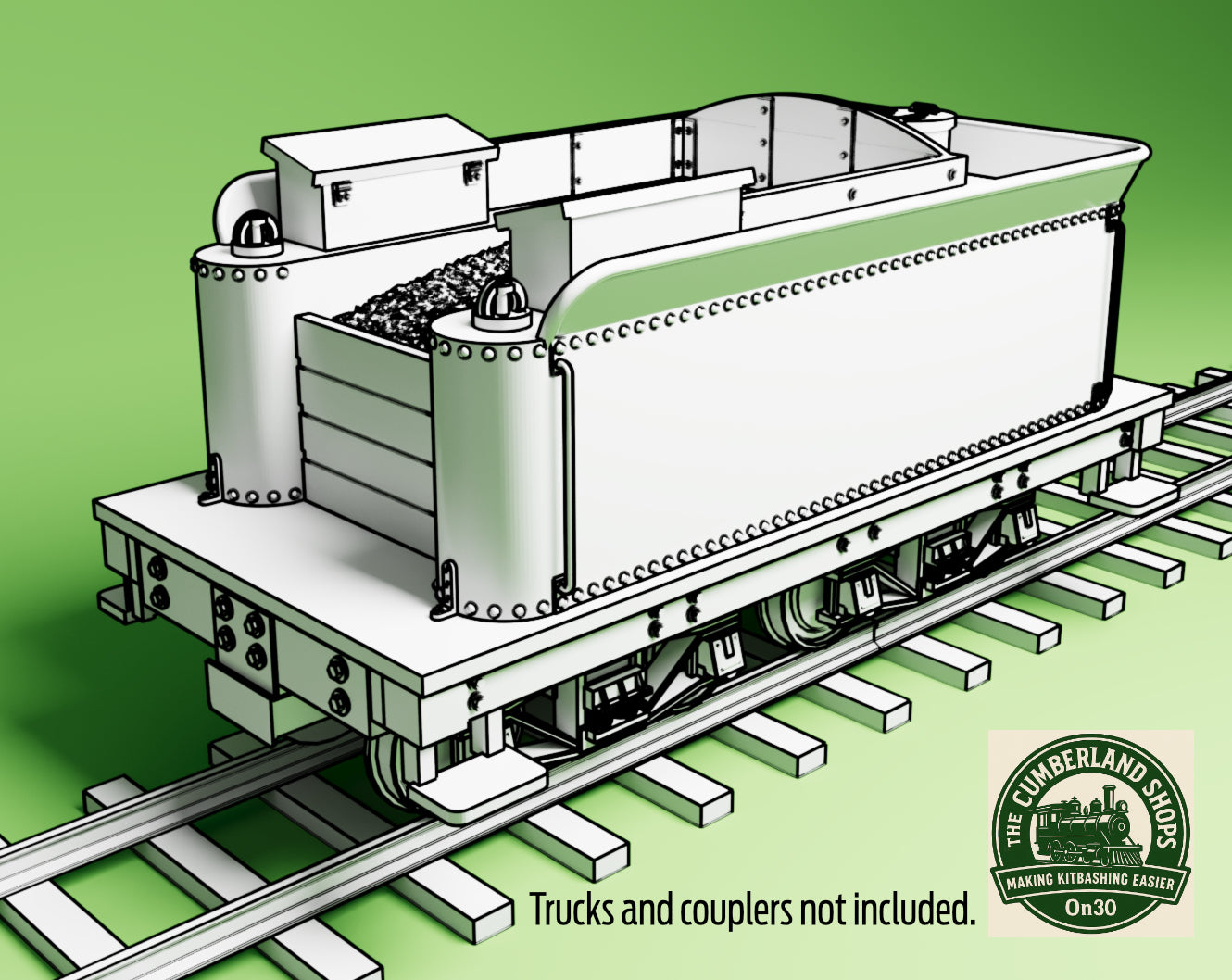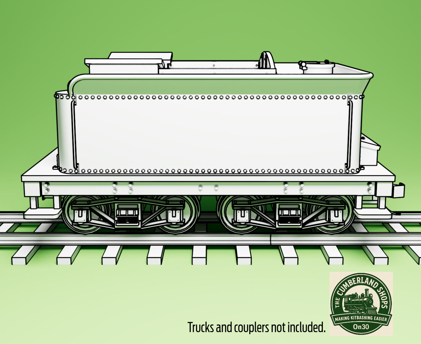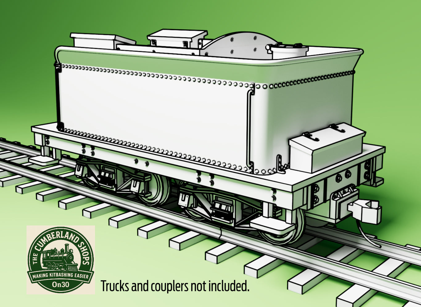 Designed to fit with medium-sized Bachmann On30 locos. It's 3.6” [scale 14’-3”] long and 1.72" [scale 6’-10”] wide. This version is a fuel & water tender, where the front would be filled with wood or coal, and there is a fake coal load in place. Designed to run on standard Bachmann On30 Archbar Trucks [not included], or we have similar arch-bar trucks made to use Kadee wheelsets.