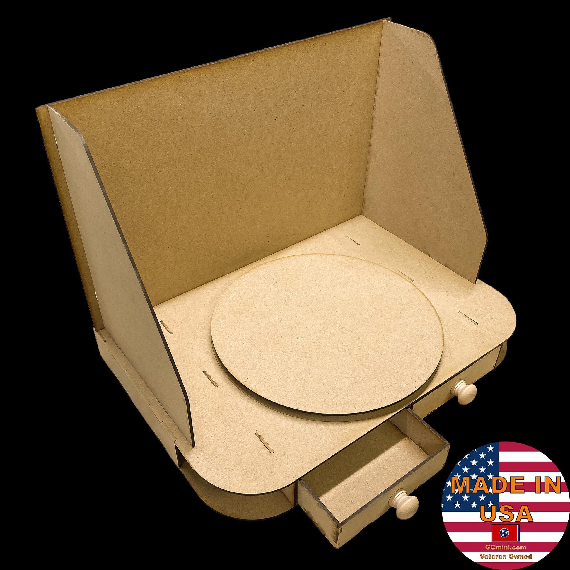 Painting station with a built-in 9 3/4" round "Lazy Susan" platform. Very handy for painting (airbrush and brush painting) miniatures and model kits. Model can be rotated to show any side you want to work on. Side and back panels are easily removable for storage.
