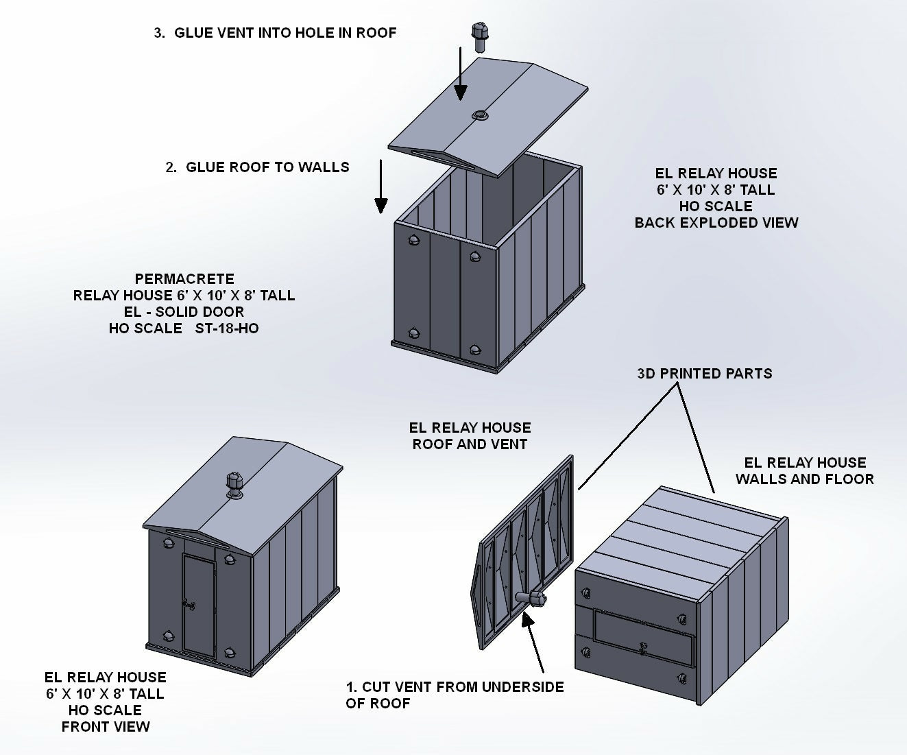 Relay House 6' x 10' x 8' High with solid door in HO scale. Made from precast concrete parts, based on a Permacrete EL prototype. Two piece kit, cut the vent from the underside of the roof, glue the roof to the walls, glue the vent into the hole in roof, and paint.