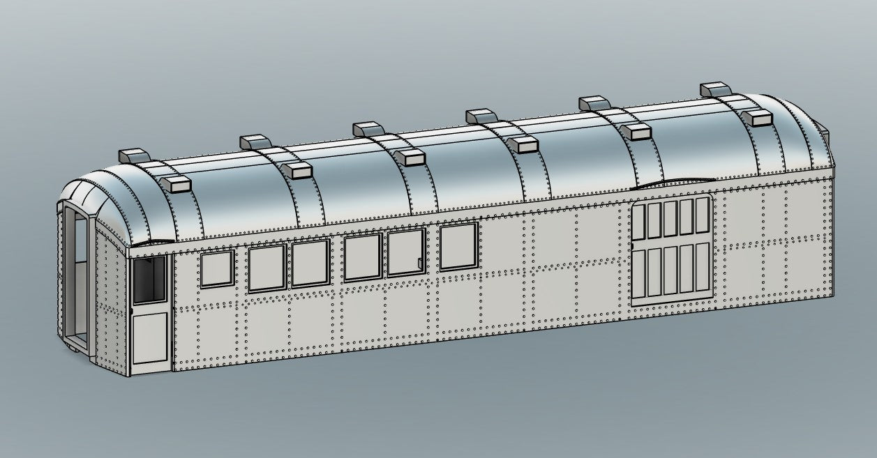 An On30 interpretation of the Harriman style arch roof combine. It is a direct replacement body shell for a Bachmann On30 combine and only requires removing the original shell and end rails. The new body attaches with 4 screws thru the rectangular openings in chassis that the original body clipped into. I used M2 self-tapping screws, but anything similar will work.